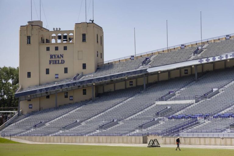 A groundskeeper walks through an empty Ryan Field, home to Northwestern football, on July 10, 2023, in Evanston. (Brian Cassella/Chicago Tribune)