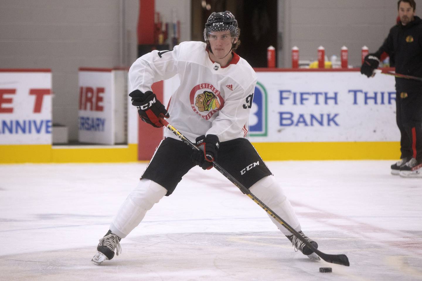 The Hawks are staking a lot on the second-round pick’s development. The 5-foot-11, 184-pound forward and first-round defenseman Kevin Korchinski were the two pieces the Hawks selected after a predraft deal that shipped All-Star winger Alex DeBrincat to the Ottawa Senators — a huge bet placed by general manager Kyle Davidson’s new administration.