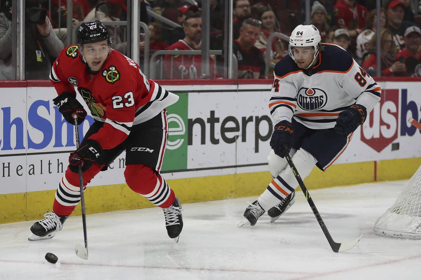 Chicago Blackhawks forward Philipp Kurashev (23) brings the puck from behind the net as Edmonton Oilers defenseman William Lagesson (84) looks on at the United Center, March 3, 2022. (Terrence Antonio James / Chicago Tribune)