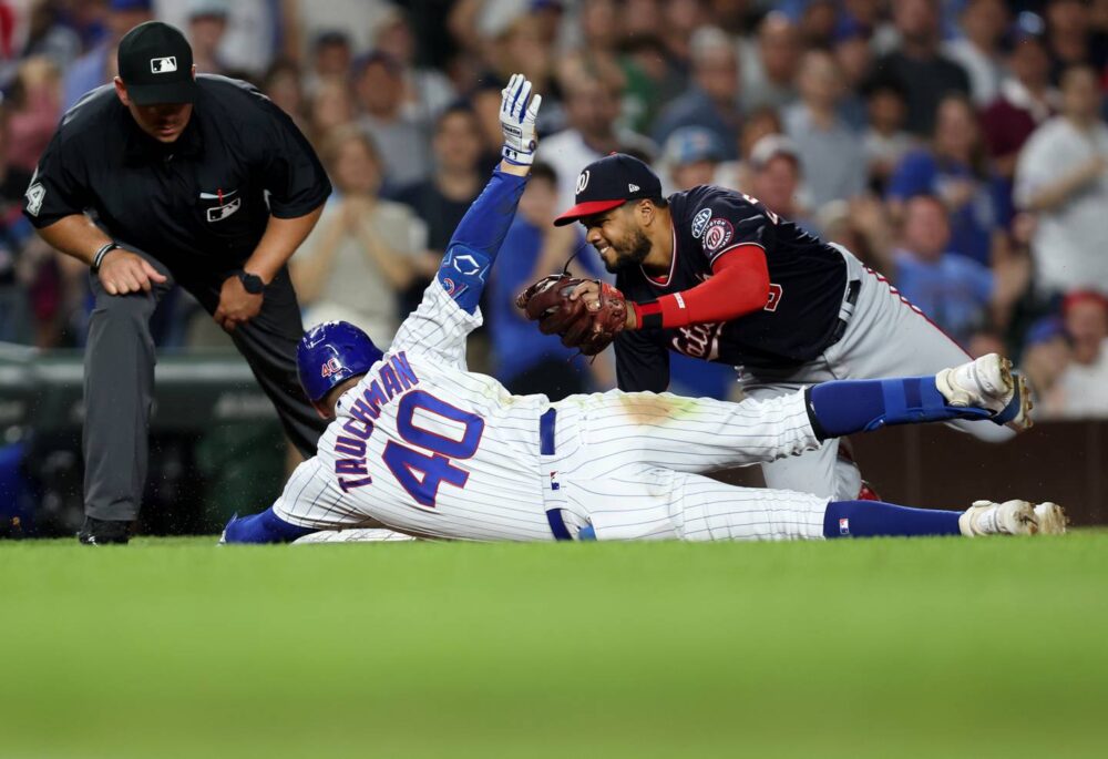 Chicago Cubs center fielder Mike Tauchman slides in to third base before being tagged out while trying to stretch a run-scoring double into a triple in the seventh inning of a game against the Washington Nationals at Wrigley Field in Chicago on July 19, 2023. (Chris Sweda/Chicago Tribune)