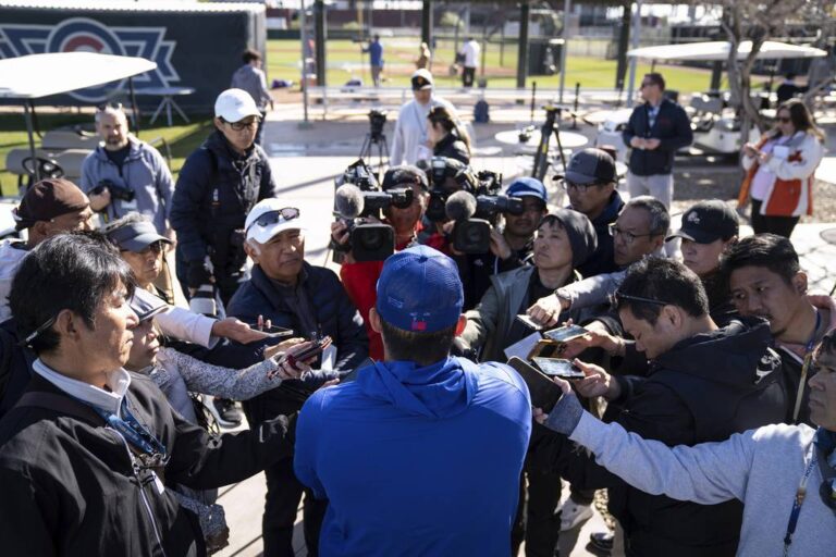 Japanese media interviews Cubs outfielder Seiya Suzuki as he discusses his withdrawal from the World Baseball Classic due to an oblique injury at Sloan Park on Feb. 28, 2023. (E. Jason Wambsgans / Chicago Tribune)