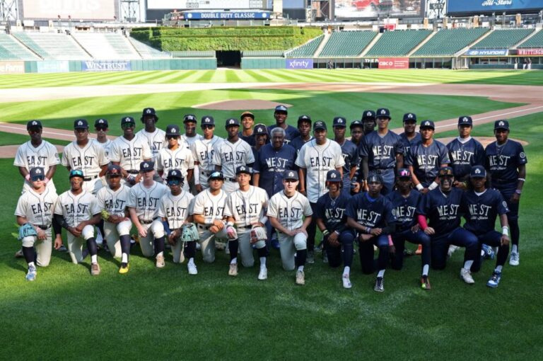 Members of the East and West teams, along with Negro Leagues players Dennis Biddle, center right, and Don Woods, right of Biddle, gather for a group photograph before the Double Duty Classic on July 18, 2023. (John J. Kim/Chicago Tribune)