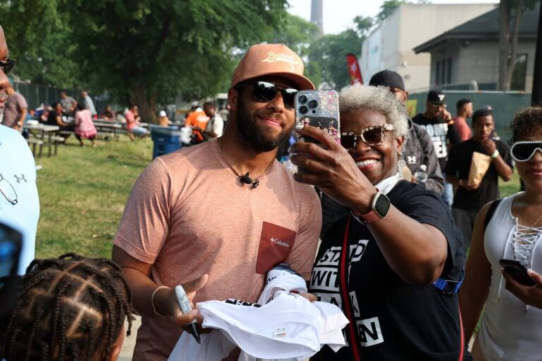 NASCAR driver Bubba Wallace meets fans and poses for photos at Bubba’s Block Party at the DuSable Black History Museum and Education Center in Chicago on June 28, 2023. The event promotes the upcoming NASCAR Chicago Street Race. (Terrence Antonio James/Chicago Tribune)