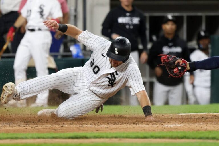 Chicago White Sox third baseman Jake Burger (30) beats the tag to score off a Zach Remillard single in the sixth inning against the St. Louis Cardinals at Guaranteed Rate Field on July 7, 2023, in Chicago. (John J. Kim/Chicago Tribune)