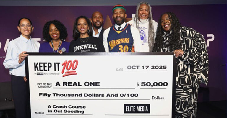 NEW YORK, OCTOBER 20, 2025 – MADE, a verification system developed to protect Black creativity, was declared the winner of the inaugural “Keep It 100” Pitch Competition sponsored by Elite Media. The winner was announced at The One Club’s “Where Are All the Black People” Conference in New York City on Friday evening, October 17. A $50,000 grant was presented to Tommy Johnson, Founder and CEO of MADE, by Chris Crawford, Founder and CEO of Elite Media, who was joined on stage by the entire panel of judges. From left to right: