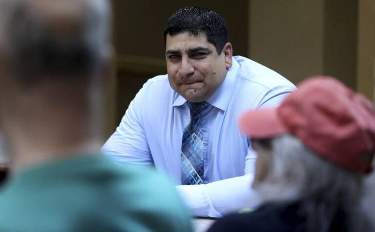 10th Ward candidate Peter Chico meets with residents at the Senior Suites of Hegewisch in Chicago on March 16, 2023. (Antonio Perez / Chicago Tribune)