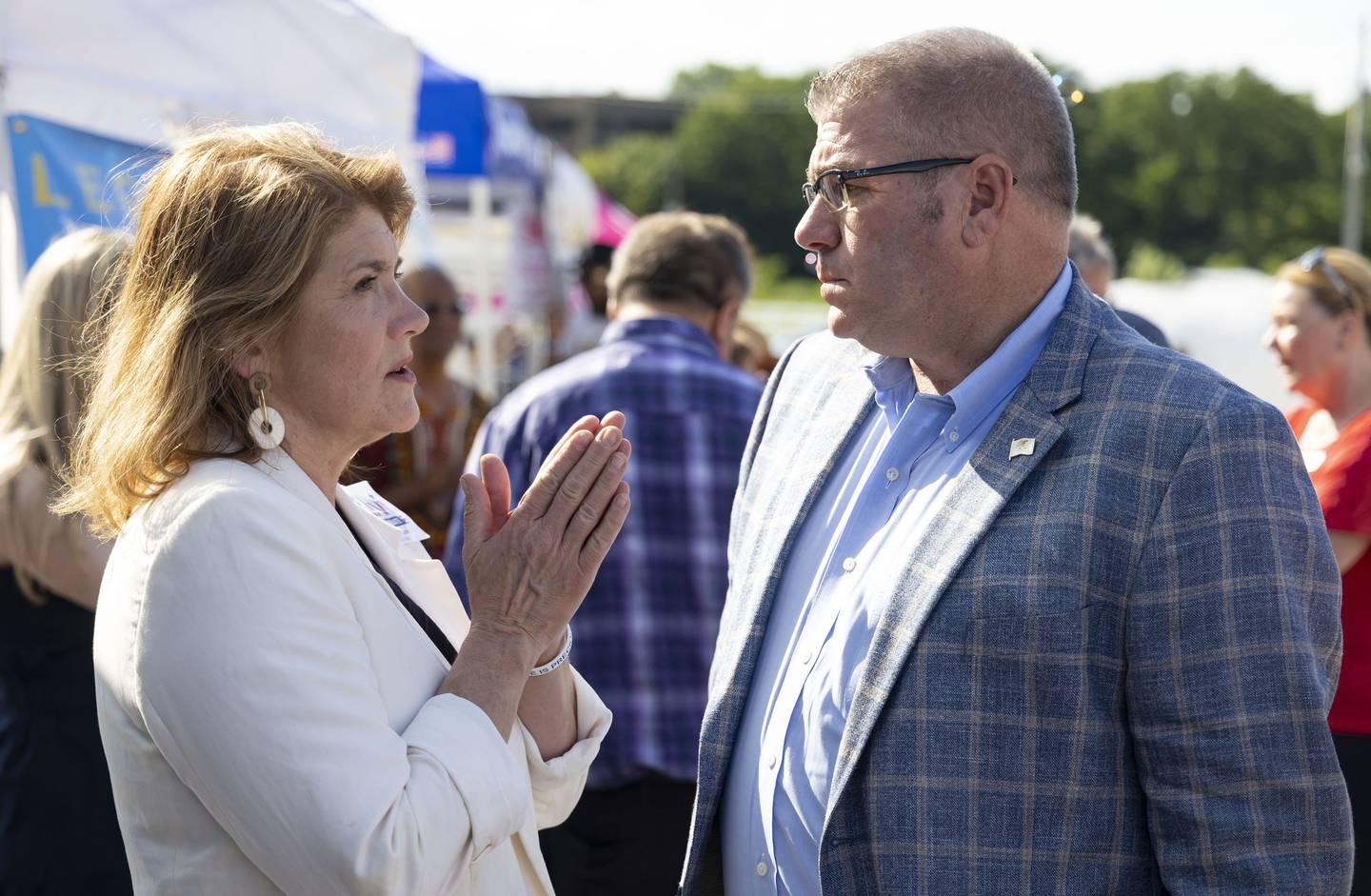 Kathy Salvi, the GOP nominee for U.S. Senate, with Republican governor nominee Darren Bailey on July 31, 2022 at the DuPage County Fair in Wheaton. (Brian Cassella / Chicago Tribune)
