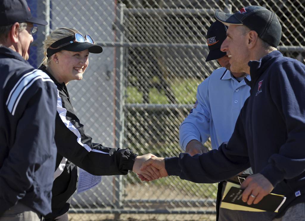 Kaneland coach Madison Mikos and West Aurora’s Randy Hayslett greet each other at home plate, meeting with umpires Guy Mereness, left, and Steeve Verive before a nonconference game on Thursday, April 6, 2023. (H. Rick Bamman / The Beacon-News)