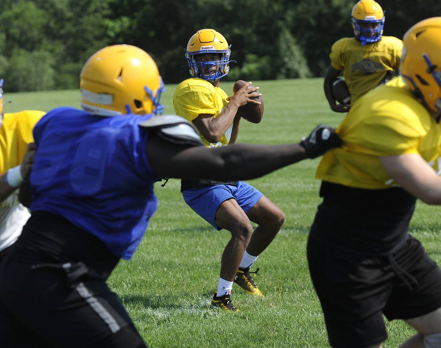 Crete-Monee quarterback Joshua Franklin fades back to pass during a preseason practice in Crete on Wednesday, Aug. 10, 2022. (Steve Johnston / Daily Southtown)