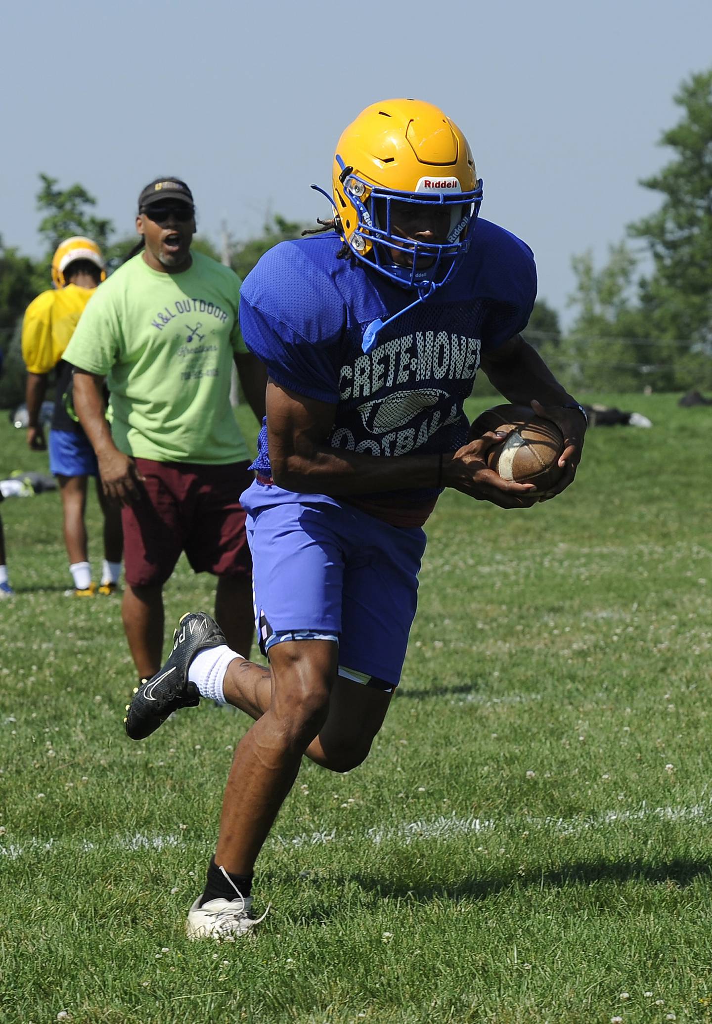 Crete-Monee defensive back Edward Clark takes off on a run during a preseason practice in Crete on Wednesday, Aug. 10, 2022. (Steve Johnston / Daily Southtown)
