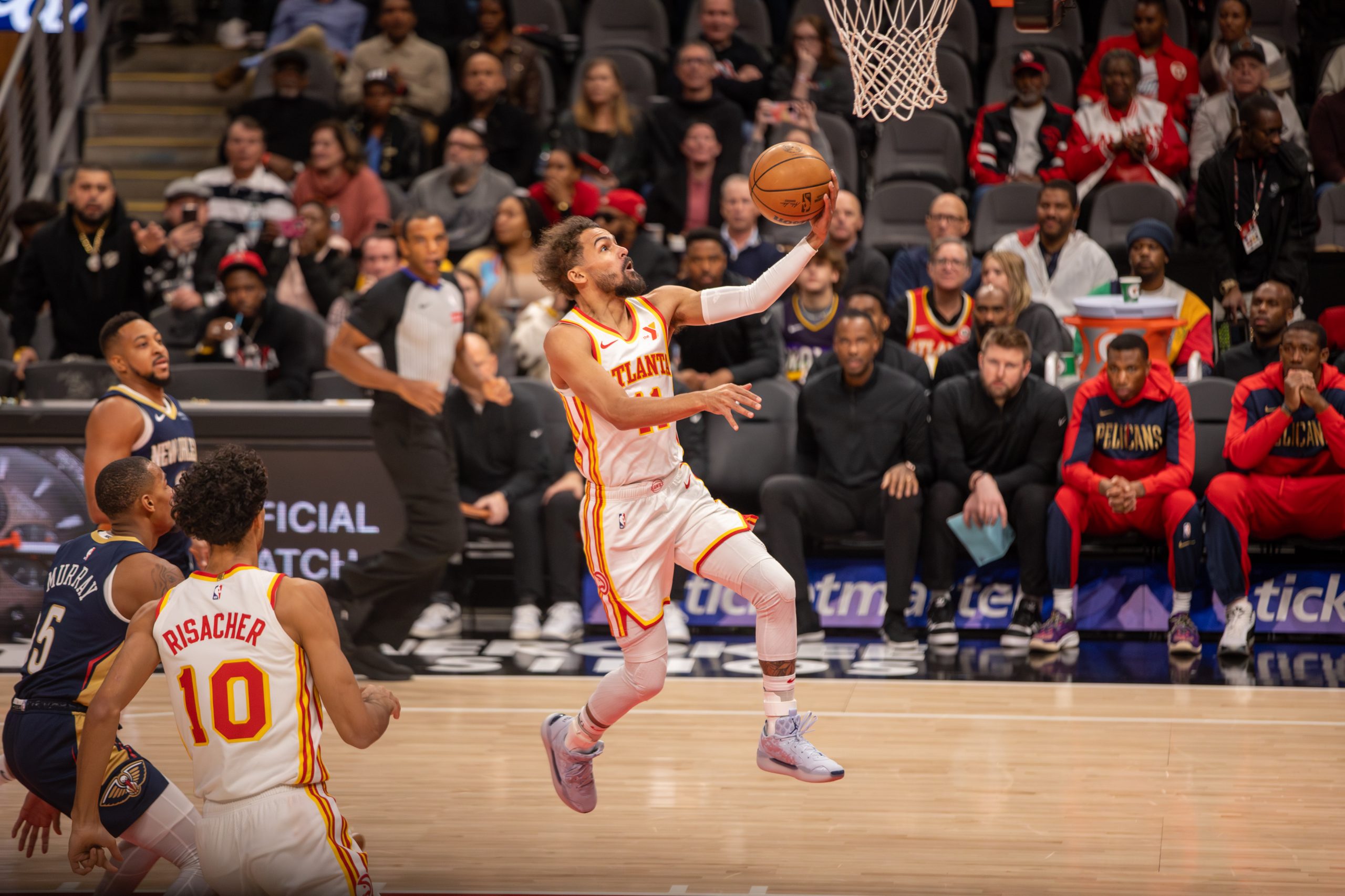 Trae Young attempts a lay-up during the first half of an NBA game between the New Orleans Pelicans and the Atlanta Hawks on Monday, December 2, 2024 at State Farm Arena in Atlanta, Georgia. (Photo: Itoro N. Umontuen)