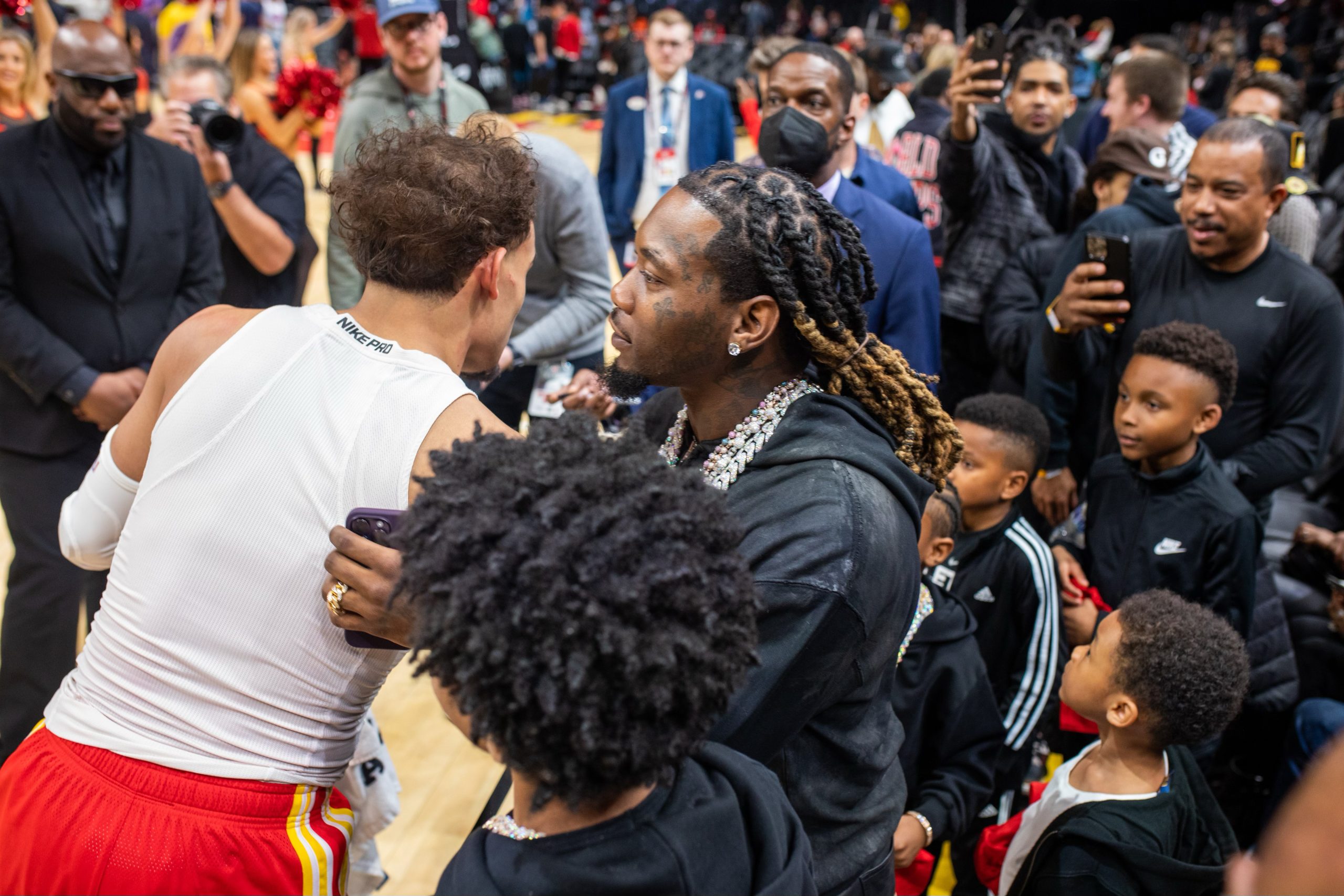 Trae Young signs his jersey for Offset after an NBA game between the Portland Trail Blazers and the Atlanta Hawks on Friday, March 3, 2023 at State Farm Arena. (Photo: Itoro N. Umontuen)