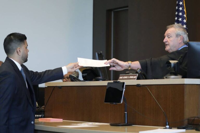 Judge George D. Strickland receives a paper from Robert E. Crimo Jr.’s attorney George Gomez during an appearance at the Lake County Courthouse, Friday, July 14, 2023, in Waukegan, Ill. Judge George Strickland on Friday set a Nov. 6 trial date for Crimo Jr. who is charged with helping his son obtain a gun license three years before the son allegedly shot dead seven people at a Fourth of July parade in suburban Chicago last year. (AP Photo/Nam Y. Huh, Pool) (Nam Y. Huh/AP)