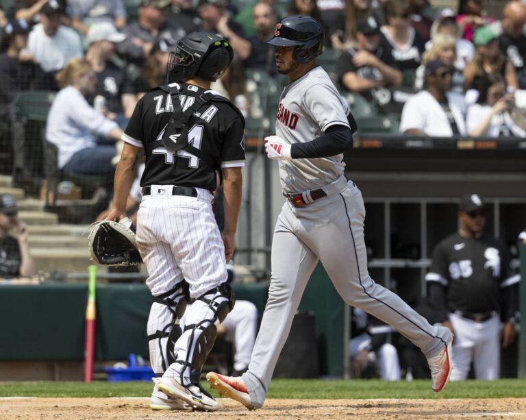 Guardians shortstop Gabriel Arias scores in front of White Sox catcher Seby Zavala in the seventh inning on May 18, 2023, at Guaranteed Rate Field. (Brian Cassella/Chicago Tribune)