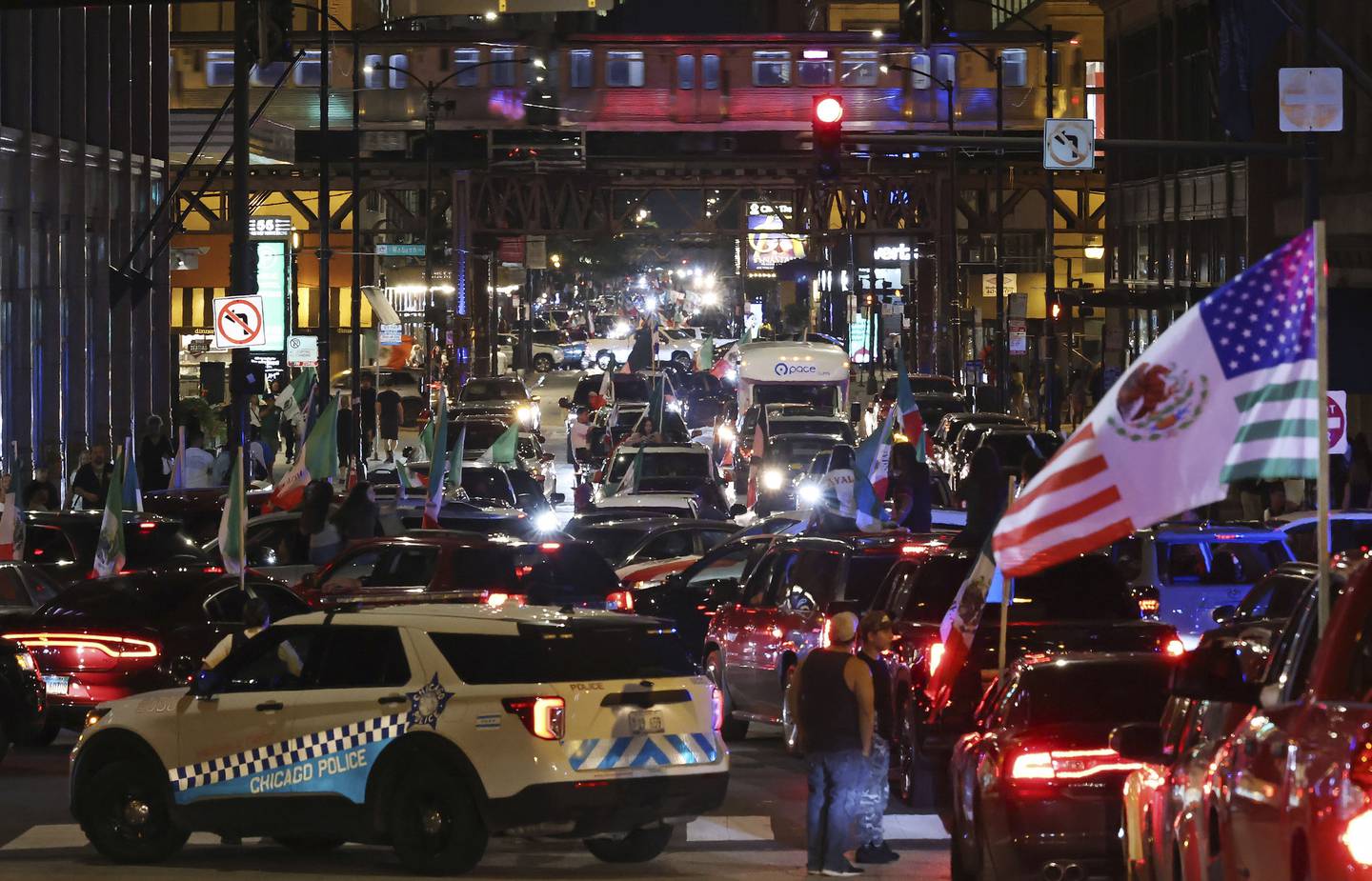 Vehicle traffic is stopped on Monroe Street as people celebrate Mexican Independence Day, Sept. 16, 2022, in Chicago’s Loop. (John J. Kim / Chicago Tribune)