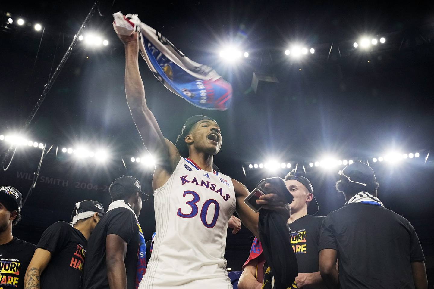 Kansas guard Ochai Agbaji celebrates after beating North Carolina in the NCAA Tournament final, April 4, 2022, in New Orleans. (Brynn Anderson/AP)