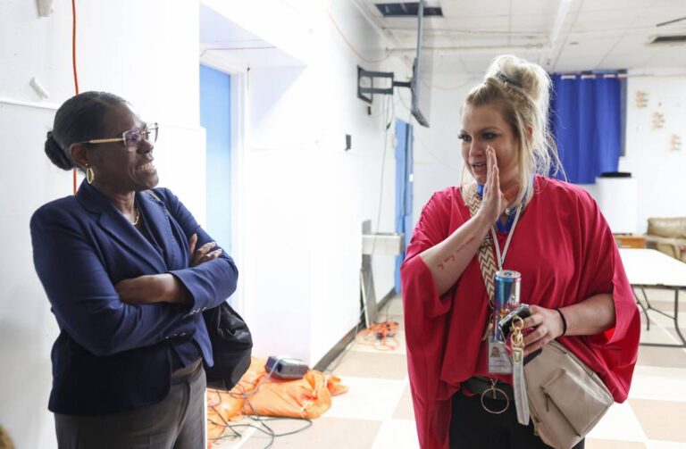Executive Director Vauna Hernandez, left, and Heather Beaubien talk after a recovery education meeting at Phoenix Recovery Support Services in the Austin neighborhood on June 13, 2023. (John J. Kim/Chicago Tribune)